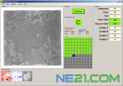 強(qiáng)大功能的缺陷分析處理軟件,包括信息預(yù)處理,濾波算法,以及高效的圖象數(shù)據(jù)分析處理算法分辨出灰度圖象非常近似的晶格和微裂紋。避免良品誤判,也避免缺陷晶片混入到下一步工藝— 電池片的生產(chǎn)中。增加良率,確保有效的質(zhì)量控制,降低了成本,從而實現(xiàn)了生產(chǎn)效率的提高。 用戶界面顯示了實際的檢測狀態(tài),包括測